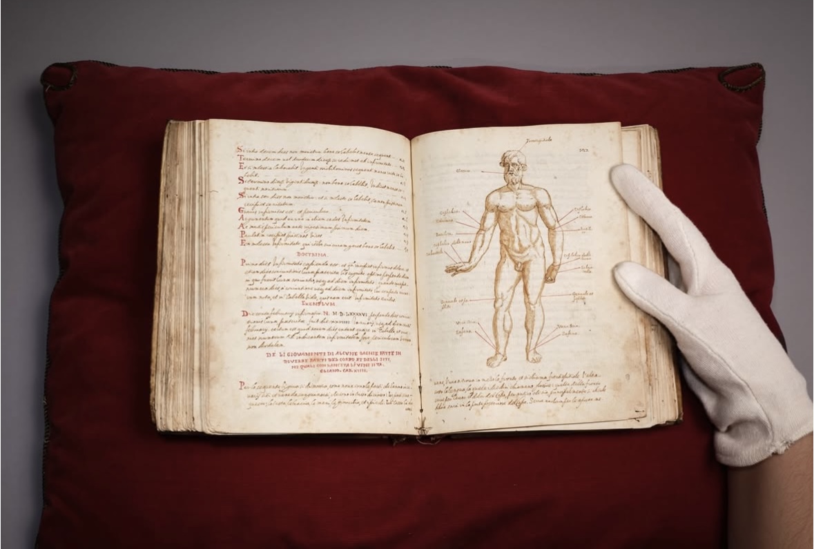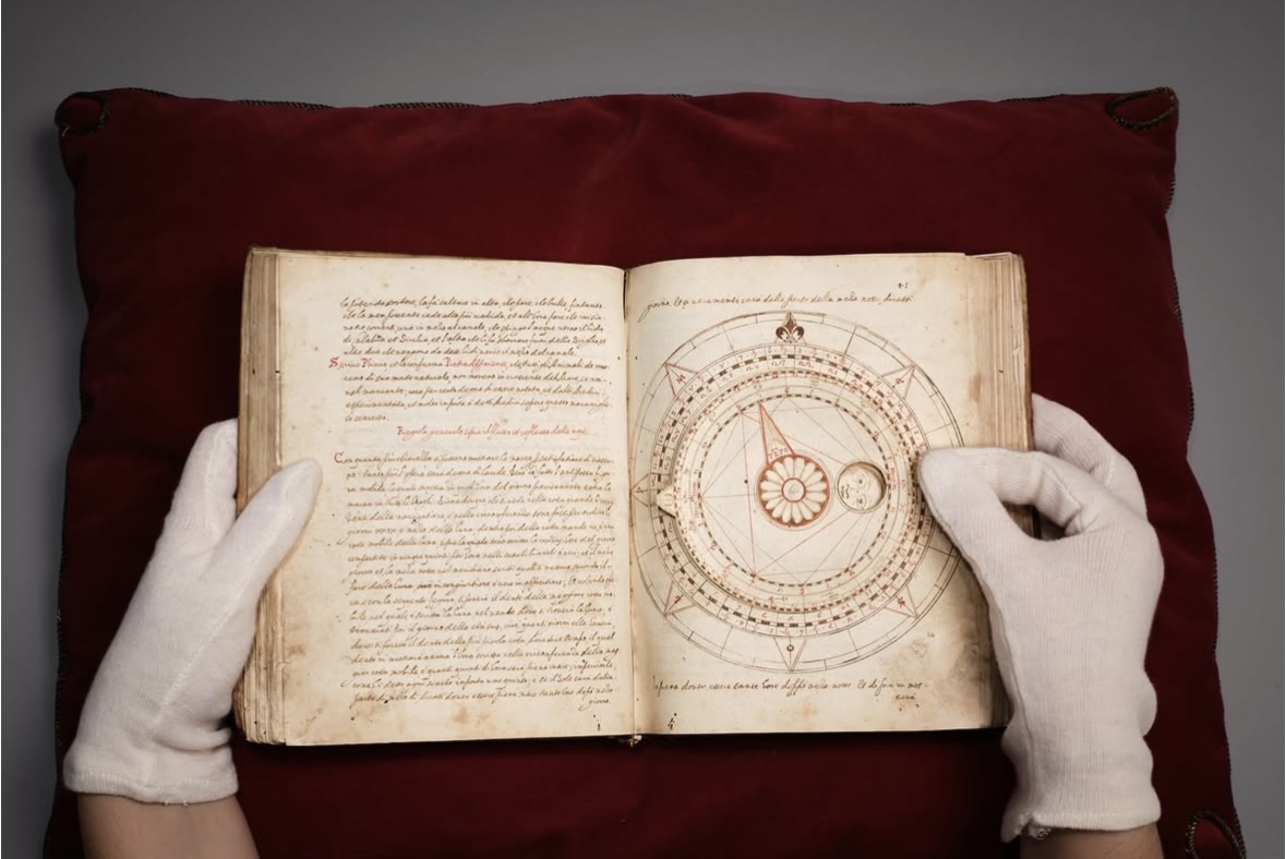The Teatro del Mondo stands out as a comprehensive compendium of Renaissance-era knowledge, drawing together ancient learning and contemporary discoveries. It covers subjects including astronomy, astrology, navigation, medicine, and human anatomy, with attention to the bodies of both men and women. Beyond its intellectual scope, the manuscript is a small artistic treasure: it features numerous hand-drawn illustrations by the author himself - realistic sketches, some incorporating movable elements.