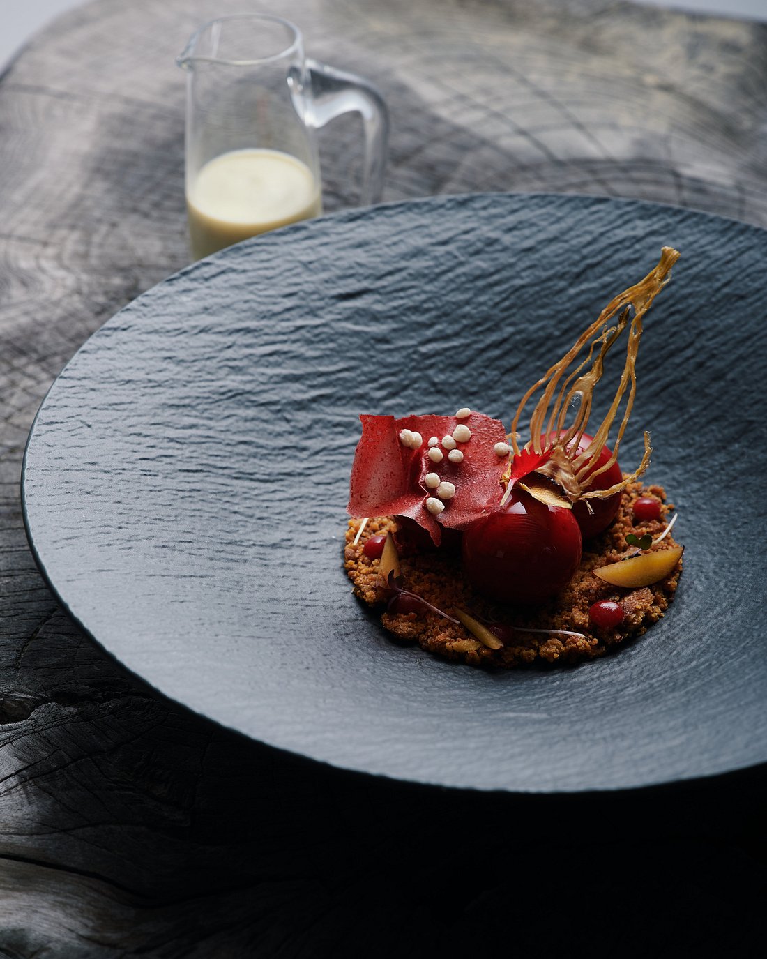 His approach resists rigid ideology. Swiss terroir forms the backbone of his cooking, enriched by influences drawn from Asia—a continent he particularly admires—and by the mountain environment itself. Herbs such as sweet woodruff and elderflower appear naturally, while peppers sourced from across the world bring vibrancy and tension to each dish.