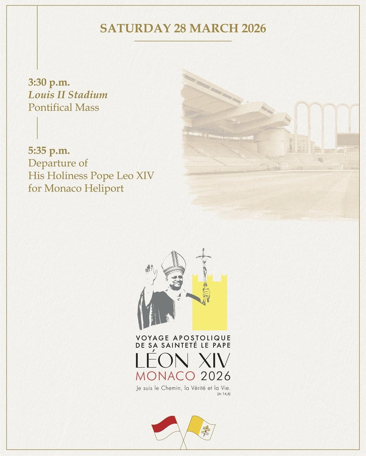 The day is scheduled to conclude with a public Mass presided over by the pontiff at the Stade Louis II, in the presence of the Princely Family, civil and religious authorities, and the faithful.