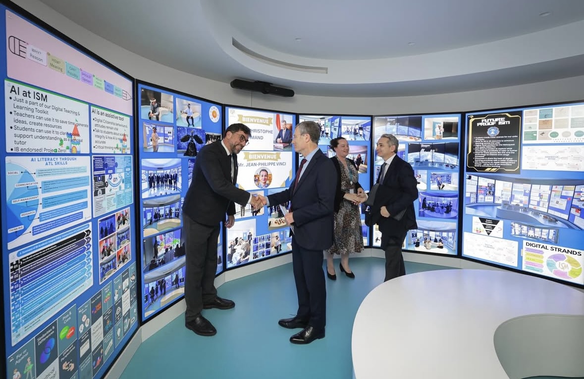 During the visit, Mr. Mirmand engaged with administrators, teachers, and staff in a classroom setting adorned with student artwork and educational materials. The gathering highlighted the school’s role in providing international education within the compact Mediterranean state.
