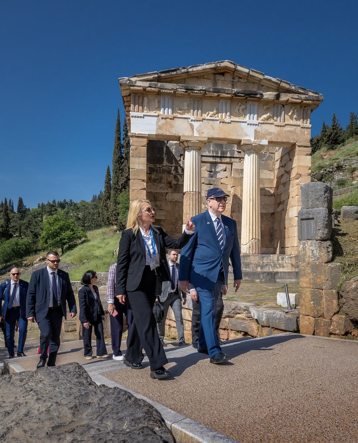 Before his visit, the Prince toured the sacred site and archaeological museum in Delphi, a significant center of ancient Greek civilization. On the margins of the forum, the Prince also engaged in a series of bilateral meetings with several officials, including the President of the Republic of Estonia, Alar Karis; the Prime Minister of the Republic of Albania, Edi Rama; and the European Commissioner for Fisheries and Oceans, Kostas Kadis.
