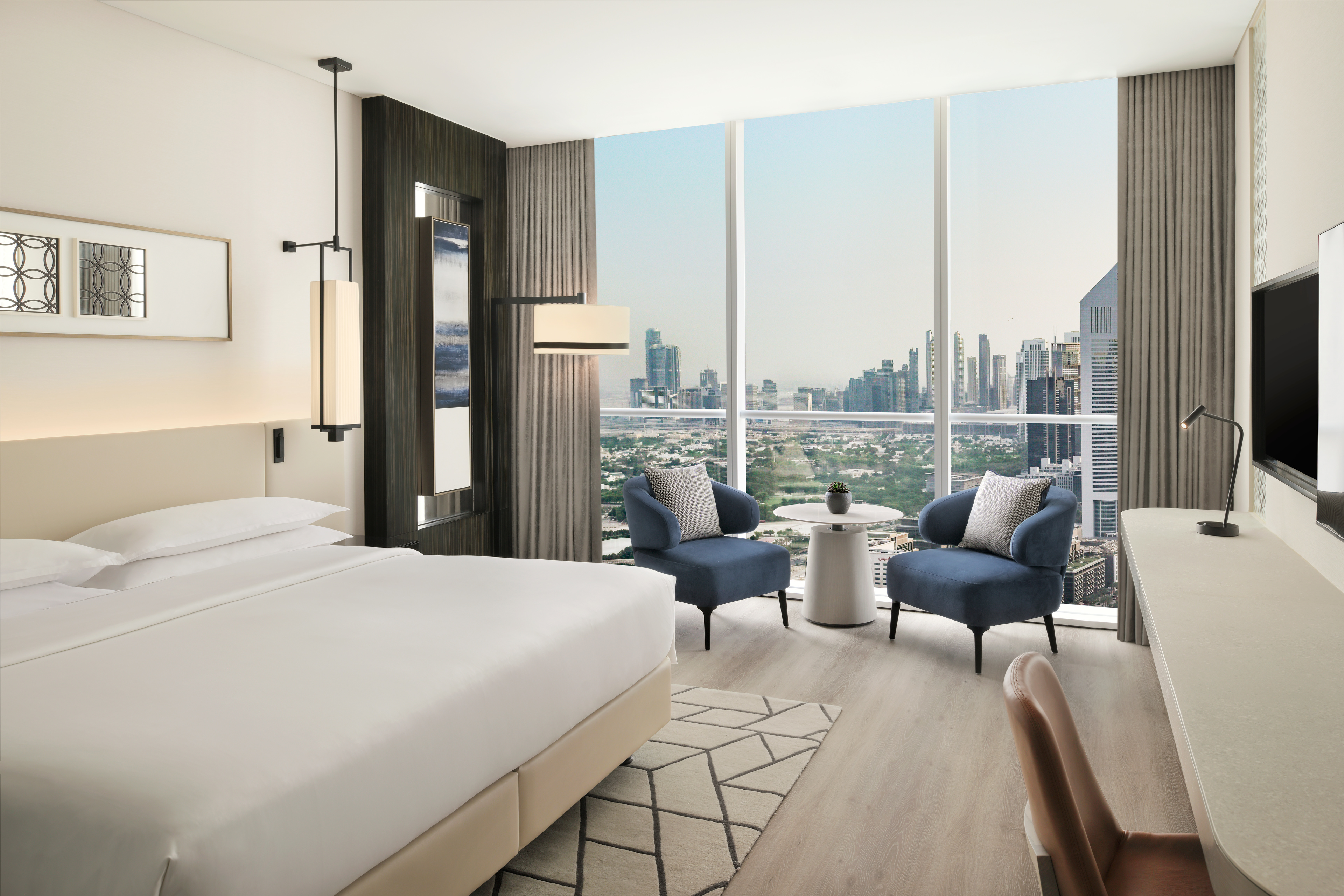 Accommodation is structured to accommodate both short-term and extended stays. The hotel offers 474 rooms and suites alongside a substantial serviced apartment inventory, allowing guests to transition between hotel living and residential comfort without changing address. Rooms are designed with functional clarity: generous workspaces, reliable connectivity, Sheraton Sleep Experience beds, and bathrooms configured for daily routines rather than leisure rituals. Floor-to-ceiling windows provide expansive city views, reinforcing a sense of orientation within Dubai’s skyline.