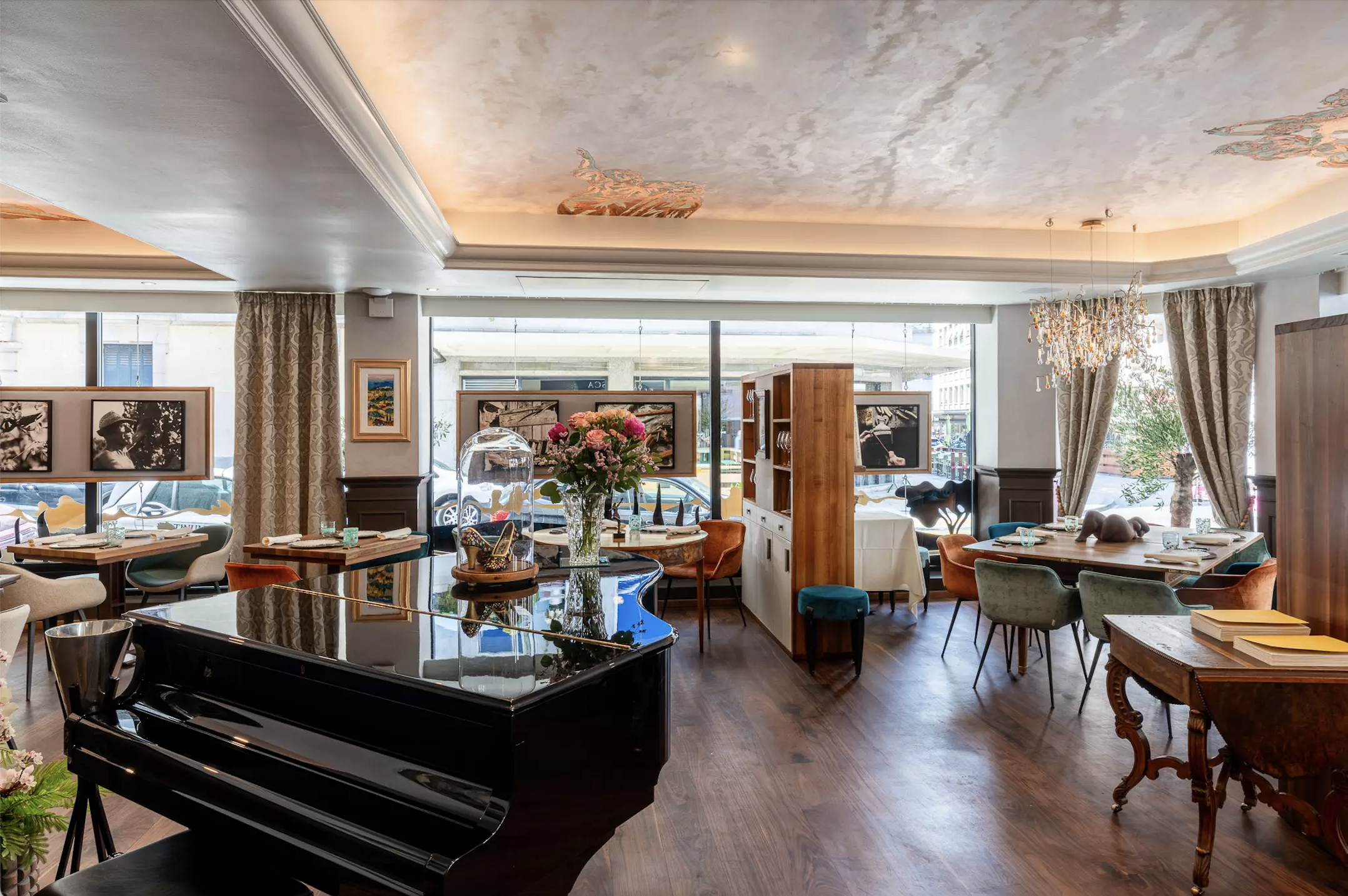 Designed by Jean-Jacques Ghelfi and Marco Borgianni, the space blends the elegance of a Florentine palazzo with contemporary artistic flair. Frescoes, Murano glass elements, antique books, and luxurious fabrics from Gucci and Pucci create a warm, timeless environment. Lace tablecloths crafted by Tuscan artisans add an intimate touch, each telling its own story of heritage and craftsmanship.